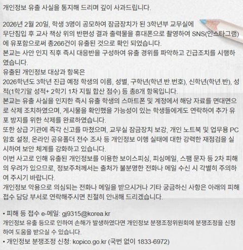 학교 측은 이번 일로 심려를 끼쳐드린 점 깊이 사과드린다며 개인정보 악용으로 인한 2차 피해가 발생하지 않도록 관리와 보안 점검을 강화하겠다고 밝혔다.