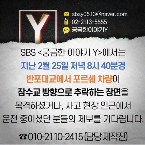 SBS는 반포대교 포르쉐 추락 사건을 목격하신 분들의 제보를 기다립니다.