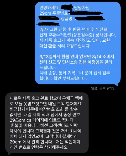 그렇게 찾아낸 번호를 제가 직접 29CM 상담 창구에 알려줘서 겨우 반품 처리가 진행됐습니다. 판매자가 해야 할 일을 제가 다 한 거죠.