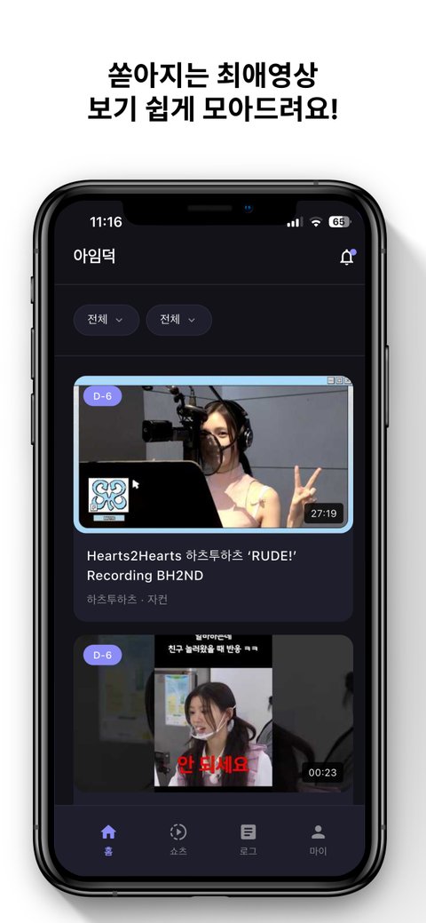 아이돌 유튜브 컨텐츠를 자동으로 수집하고 정리해주는 큐레이션 앱이야최신 트렌드에 맞게 4~5세대 아이돌 위주로 다루고있어앱스토어와 플레이스토어에 정식 출시되었어