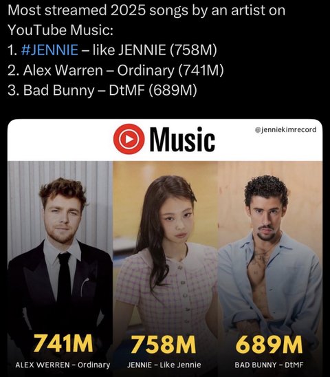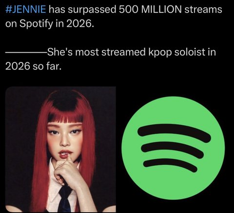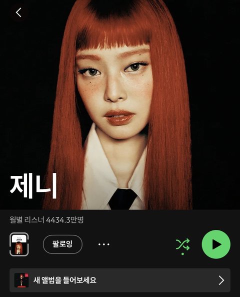 현재 제니 스포티파이 월별 청취자 4400만으로 k팝 가수 최다 (2위가 2900만으로 로제)