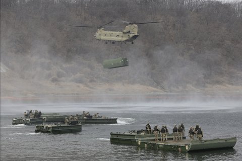 (사진4 설명) 14일 경기도 연천군 임진강에서 실시된 한미연합 도하훈련에서 미군 시누크 헬기가 부교를 공중 수송하고 있다. 한미연합훈련 '자유의 방패'(프리덤실드·FS) 연습 일환으로 실시된 이번 훈련에는 미2사단/한미연합사단과 한국군 수도기계화보병사단 및 7공병여단이 참가했다./연합뉴스
