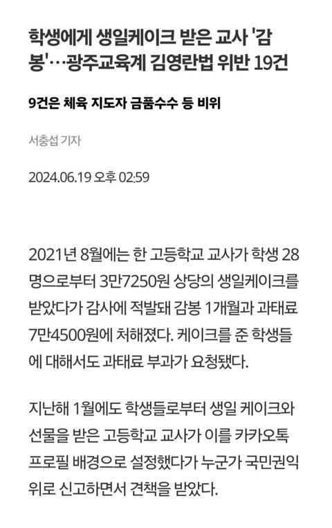 당연한 거임 당장 학생 때 생각해도 부모님 통해서 스승의 날 선물 보낸 학생들은 진짜 이쁨 받았고 선생한테 이것저것 갖다바치는 애들도 이쁨 받았음 학생 입장에서 다른 애들은 이쁨 받는데 자기는 해당 안 된다? 서운할 수 있음 그러다보면 불안한 마음에 적은 용돈으로 선생 선물사게 될 수도 있고 부모님께 선생 선물 사달라고 할 수도 있겠지 생일 케이크처럼 돈 모아서 사주는 것도 막는 게 맞아 나서는 거 좋아하는 애들이 선생한테 케이크 사주자고 부추기는데 소심하고 용돈 적게 받는 학생이 싫어도 돈 내는 경우가 생길 수 있잖아 이런 경우까지 전부 깔끔하게 방지할 방법이 없다면 차라리 원천 차단하는 게 맞지