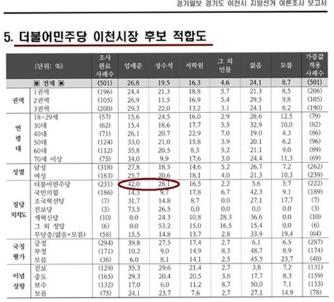 실제 해당 조사에서 후보 적합도는 엄태준 42.0%, 성수석 28.1%로, 두 후보 간 격차는 오차범위(±4.4%p)를 벗어난 13.9%p였다.