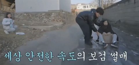 최선을 다해 그늘로 만들어진 열악한 빙판 위에서 썰매 태워드림