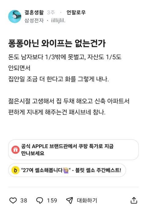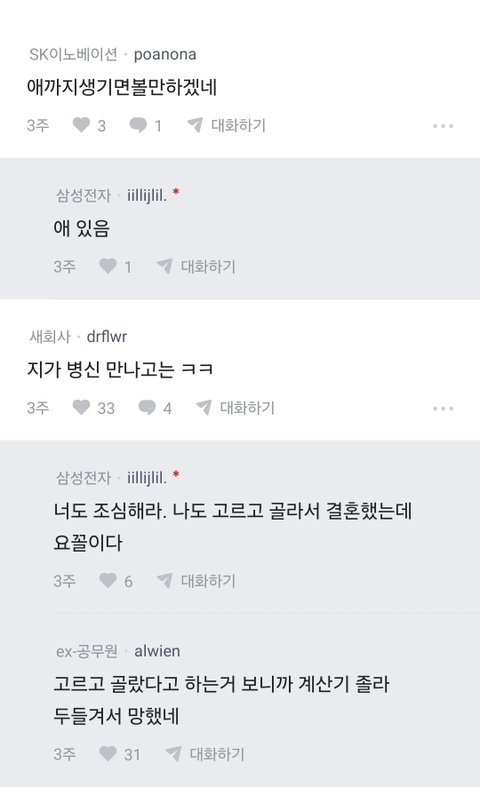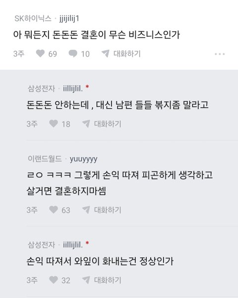 자기는못생겻고 와잎은 이쁘다는말은 왜 뺀건지 안그랬으면 저렇게 손익따지시는분이 결혼을 했겠음 이제 와잎이랑 애낳고 시들하니 아쉬운갑지