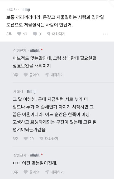 대기업에 연봉높고 집두채 있는 남자가, 200따리에 모은거없는 여자를 만난거보면 100% 여자얼굴 때문에 만난걸텐데.. 결국 남자는 재산이있고 여자가 이쁜얼굴이라 결혼이 성사된거임.. 여자 입장에서는 맞벌이 해주고 임출육까지 해줬는데 남편이 집안일 조금이라도 덜하는 모습 보고 정떨어졌을듯... 처음읽을땐 남편이 딱했는데 두세번 읽어보니 걍 도찐개찐임 ;