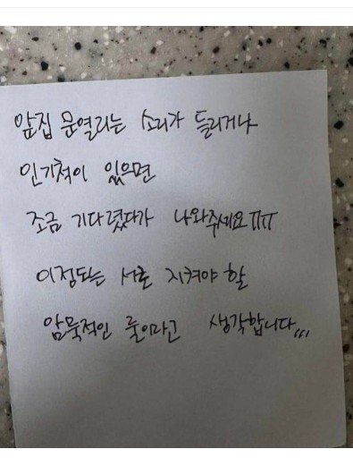 저 쪽지 붙인 년 출근하는 시간에 계속 문 소리내고 있으면 저 년 출근 못 하냐?? 뭔 개소리야 저게.