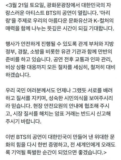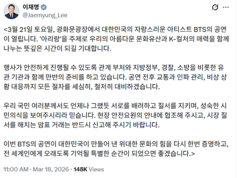 이재명 대통령 BTS 응원글