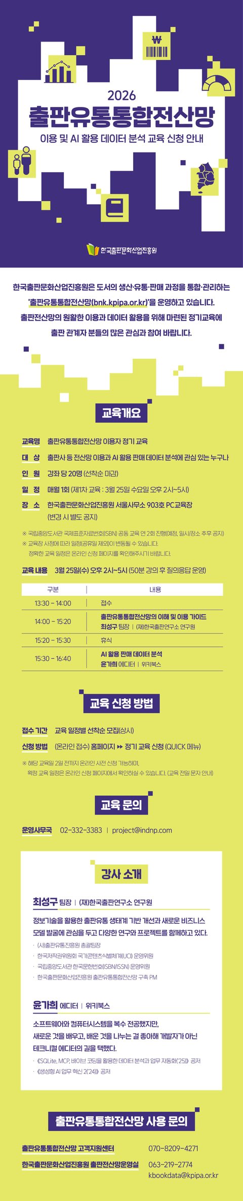 [2026 출판유통통합전산망] 이용 및 AI 활용 데이터 분석 교육 신청(~3/23)