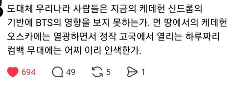 대단한거 알겠는데 내가 불편을 감소해야할만큼 좋아하지않은다고 반기지안는다고 마치 매국노 취급하면서 국의선양한 내새끼 욕하지마 하는거 너무 별로야 대단하지 않다는게 아니고 대단하면 나 찍소리도 못해야됨? 이거임 근데 아미들다 내새끼 컴백한다는데 닥쳐 광화문이 뭐 대수라고 공연해준다는데 넙죽가만히있어 이러는데 안빡치겠음??? 내생각에 진짜 돌판 통틀어 역대급 민폐컴백이라고 생각함