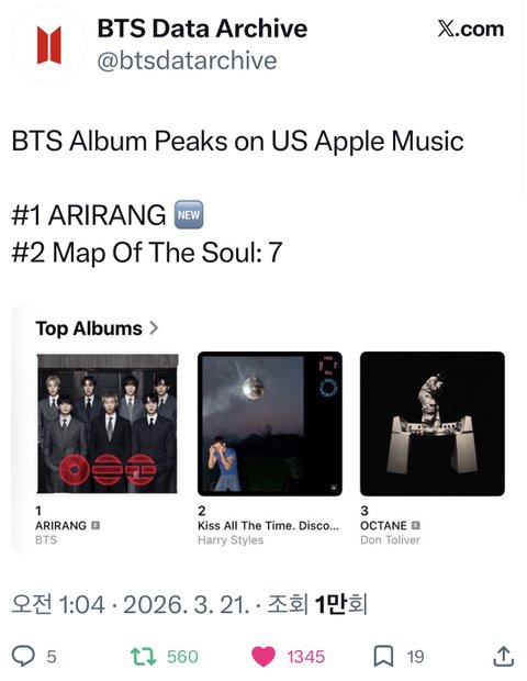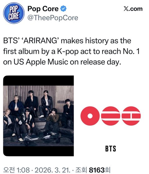 미국애플뮤직차트에서 최초로 1위한 케이팝 가수 기록세움
