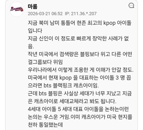 북미 걸그룹은 캐츠아이가 맞긴한데 그것보다 블핑 문제는 캐츠아이 뿐 아니라 뉴진스가 이미 추월해가던 중이었음 근데 안타깝게 상황이 그렇게 되고 지금은 스트레이키즈도 이미 블핑을 추월하는 포지션임 미국 스포티파이 블핑보다 잘 나오던데