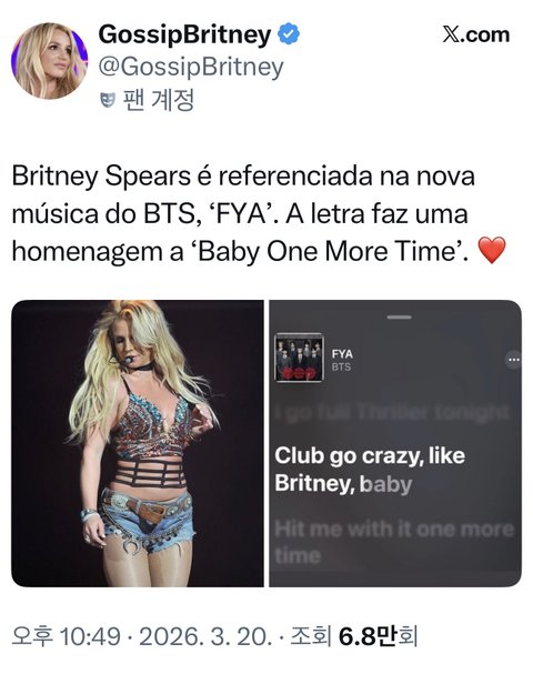 걍 브리트니 레전드때 찬양? 느낌아냐? 내가 잘못이해힌거임? 왜 방탄이 브리트니를 모욕했다고 난리인거임