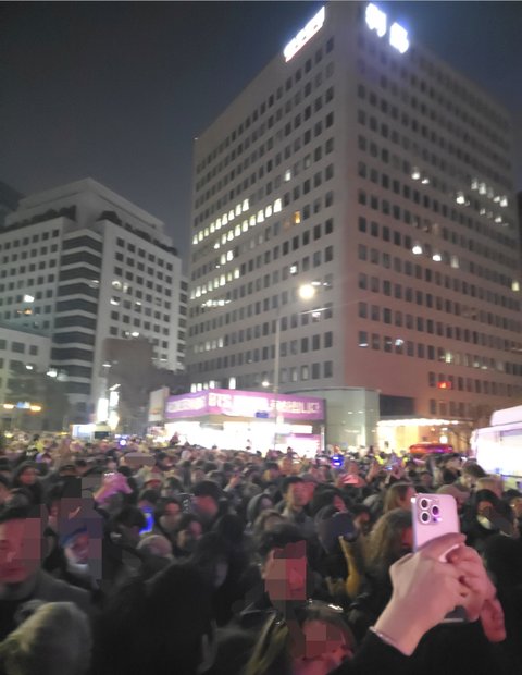 이많은사람들이 전광판도 보지도 못하고 한시간동안 서서 가만히 있었음 경찰들 바로 앞에있어서 즐기지도못하고