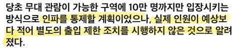 애초에 26만명 예상하고 그많은 공무원들 투입시키고 교통통제 시민들 몸수색 등등 아주 많은 것들을 통제 시키면서 지랄발광을 했는데 공연에선 못들어가게 막았데? 그것부터가 이해 못하겠는데?