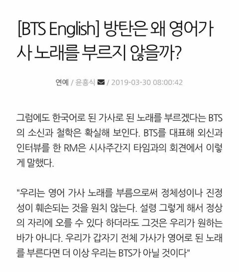 "우리는 영어 가사 노래를 부름으로써 정체성이나 진정성이 훼손되는 것을 원치 않는다. 설령 그렇게 해서 정상의 자리에 오를 수 있다 하더라도 그것은 우리가 원하는 바가 아니다. 우리가 갑자기 전체 가사가 영어로 된 노래를 부른다면 더 이상 우리는 BTS가 아닐 것이다"