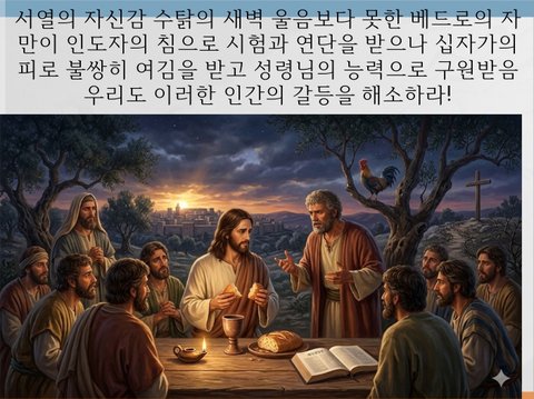 이러한 갈등 관계는 우리의 연인간에 또 부모와 자식간에 직장의 동료간에 또는 목회자와 여러분간에 수없이 이뤄지는 것입니다. 그 연단 가운데 오직 한길 예수님의 피로 모두 통과 하여 시험을 이기시고 구원 받아 화목하시기를 예수님의 이름으로 축원을 드립니다.