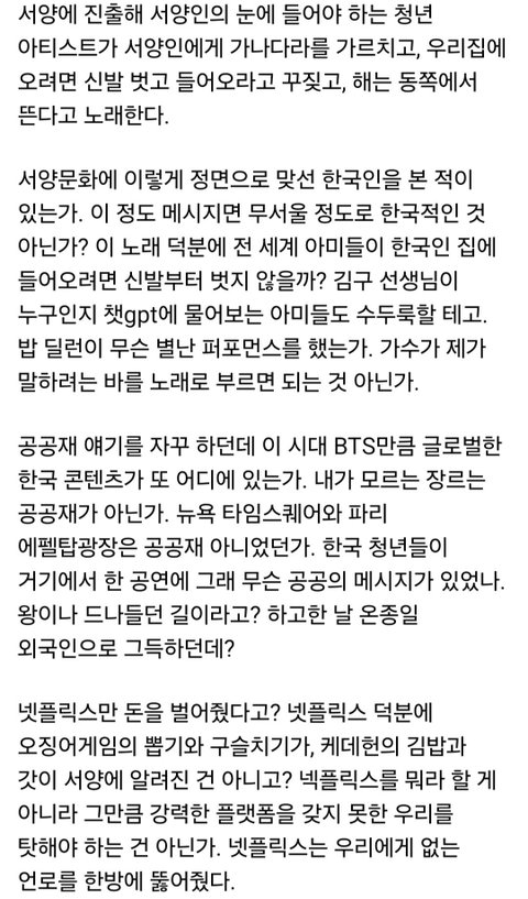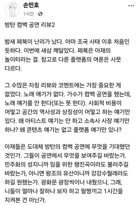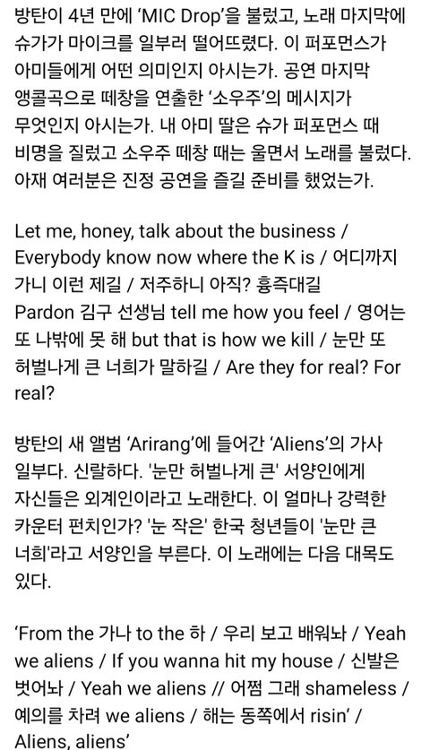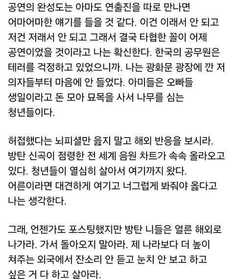 난 방탄이 이런 큰 행사 하는 거 찬성파였는데 우리나라는 아직 대형컨텐츠를 누릴 수준이 안 됐다고 인정할 수밖에 없더라 오죽하면 외국인들이 왜 한국인들은 자국스타를 못 잡아먹어서 안달인지 의아해 하니...