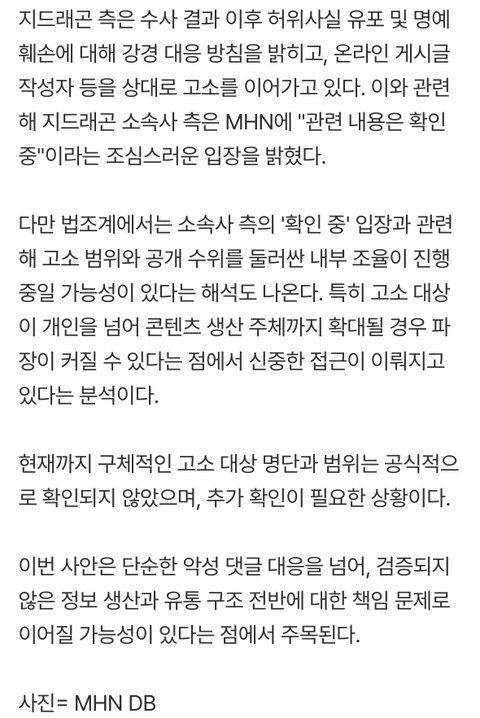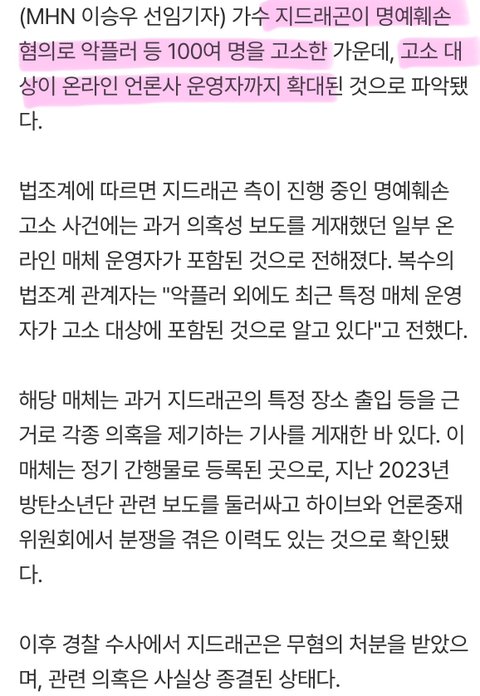 지드래곤 악플러 100명이상 고소하고 온라인 언론사 운영자까지 고소했대 소속사가 추가적으로 계속 고소예정이라고 함