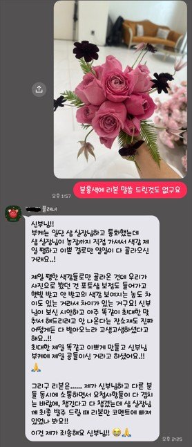 이런 식의 답장이 왔어요..ㅎ 도대체 포토샵 보정을 어떻게 해야 이정도로 다른 부케가 오는걸까요...? 그리고 최대한 쨍한 색으로 만들어 달라고 요청한게 아니고 그냥 난 저 부케를 주문을 한것인데... 같은 색의 꽃이 없다면 바로 연락을 해야하는게 정상 아닌가요..?