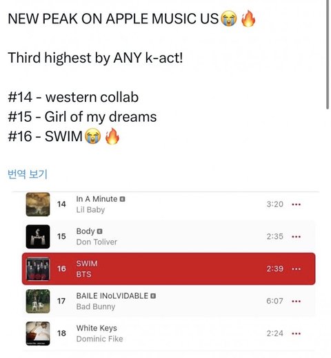 미국 애플뮤직 16위 단독으로는 케이팝 커하
