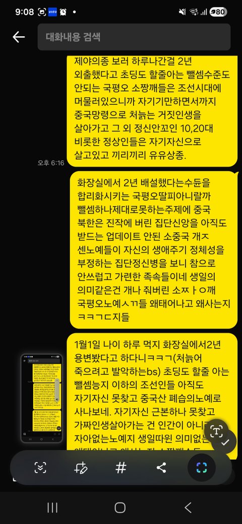 대응팁1>>그러면 왜 너네들은 화장실에서 2년 있었다고 뺄셈할 줄 아는 초딩도 안하는 정병 인증하냐. 자기생애주기 부정하면서 중국 북한도 버린 폐습의 노예자처하는 주제에 처늙어보이러 발악하는 너네들의 정신상태가 안쓰럽다. 나이가 아닌 너네들 생일 인생인데 돼들은 미 졌는지 지 자신 스스로의 근본마저 부정하다니 왜 태어나고 왜사냐. 평생 주변국들 죄다 처버린 집단망령의 노예로 살아라. 가짜인생 사는 가련한 조선노예들