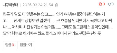 팬들은 첫 주 ar 대놓고 깔린 방송을 라이브라고 주장하더니 진짜 앵콜이 나오니… 화제성이 없으니 망정이지 다른 하이브돌들이 이랬으면 ...