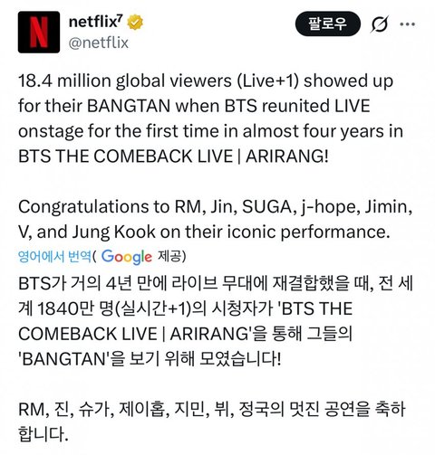 넷플 라이브 1840만명 시청