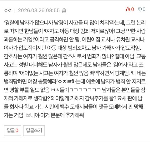 그알, 용형, 꼬꼬무, 스모킹건 등등 현존하는 프로그램들 보면 한국 전쟁 이후 70년 이상을 남경들이 친 사고가 뭐 셀 수 없을 정도로 많은데도 여경만 패고 여경 뉴스는 ‘여경’이라고 어그로 끌면서, 심지어 본문에 뉴스는 ’남경‘이라는 말도 없는데 밑댓은 왜저럼? ㄹㅇ 에게남