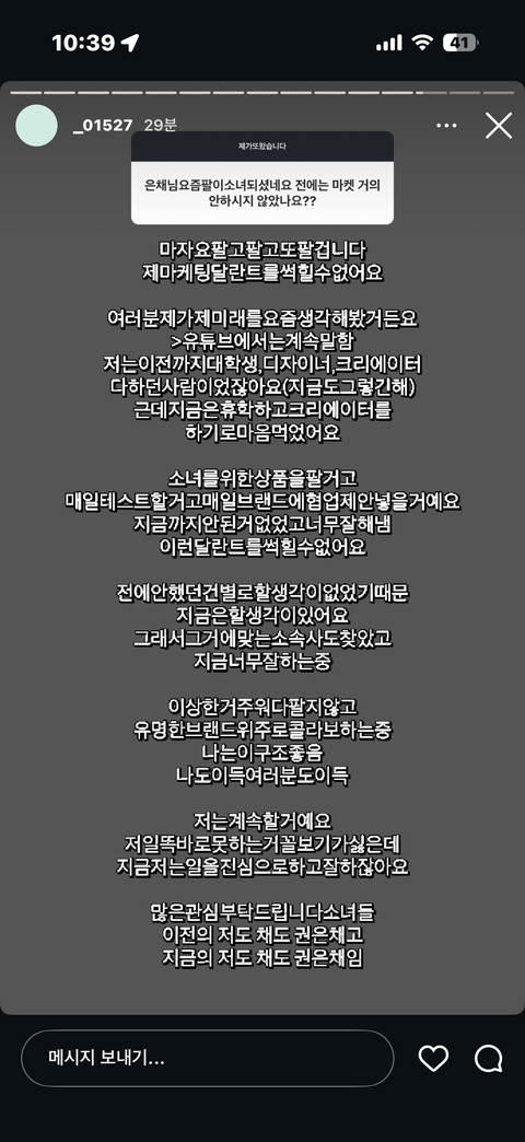 처음 보는 사람이라 읽어봤는데, 강하게 어필하는 건 느껴지긴해도 오글거리는 건 모르겠네 열심히 하고있고 잘하고있고 앞으로도 잘할 거 니까 믿어달라는 내용으로 읽힘 하는 것도 없는데 허세 부리고 있는 척 하고 그런 사람들이 더 오글거리더라 뭐 각자 관점이 다르니깐 오글거릴 수도 있다 생각함