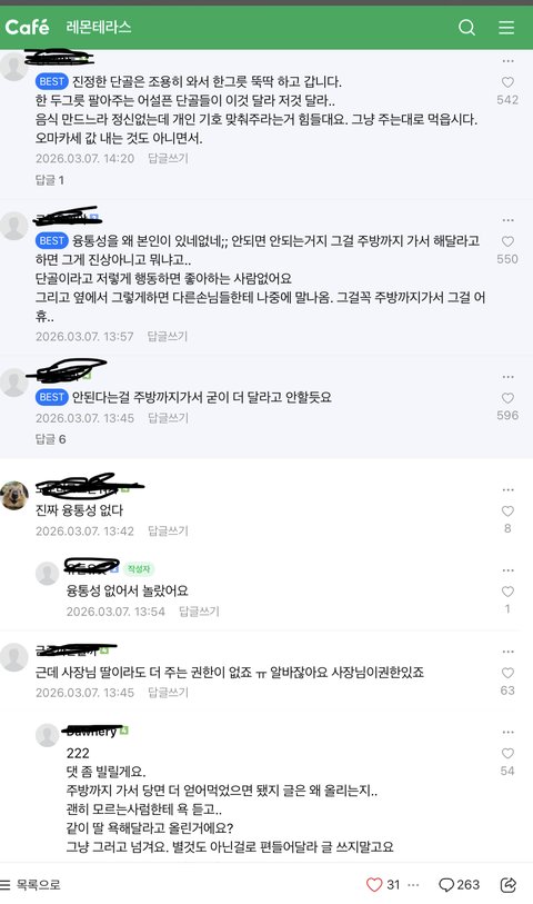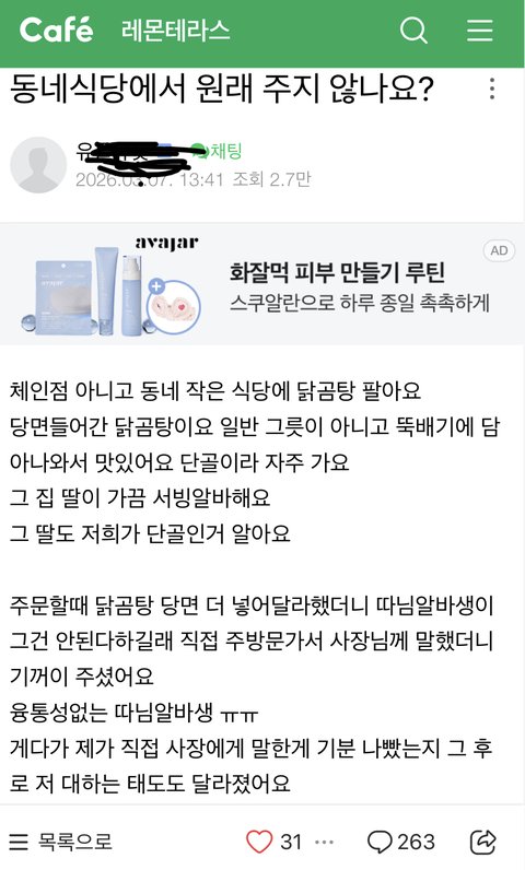 단골은 손님이 만드는게 아니라 주인이 인정하는것 어설픈 애들이 몇번 왔다고 단골이라 생각하더라고... 그리고 더주고 안주고는 알바가 결정 못하지... 그걸 주방까지 가서 더 달라고 했으면...하...진상... 단골이라고 우기는 진상....