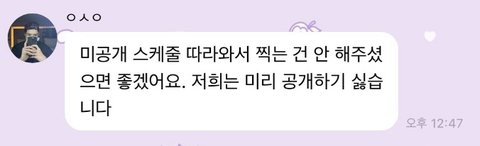 비공 스케에 사생 따라붙어서 오늘 시온이랑 리쿠라는 멤버가 자기들 버블에 저런 메세지보내서 팬덤내에서 호불호 엄청 갈리는중이라던데 니네 생각은 어때?