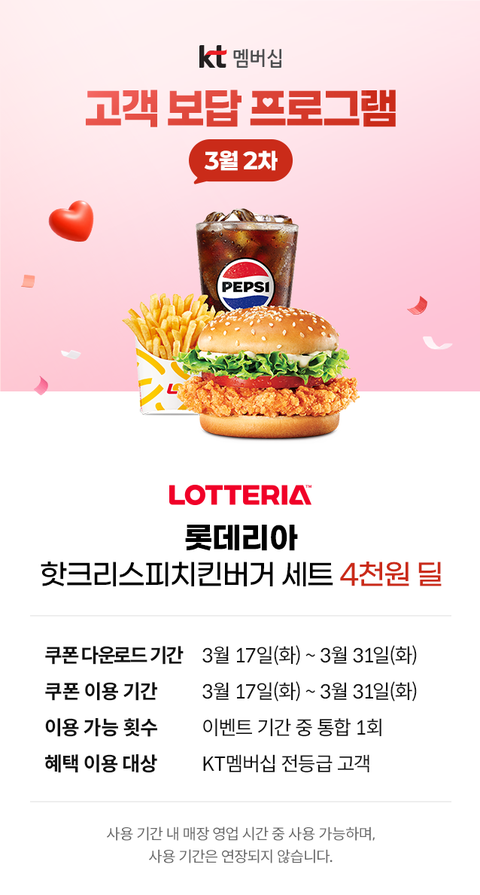 kt 통신사 쓰면 지금 롯데리아 쿠폰 받을 수 있음!3월 31일까지 받고 써야해서 며칠 안 남음