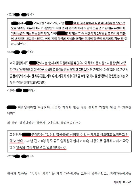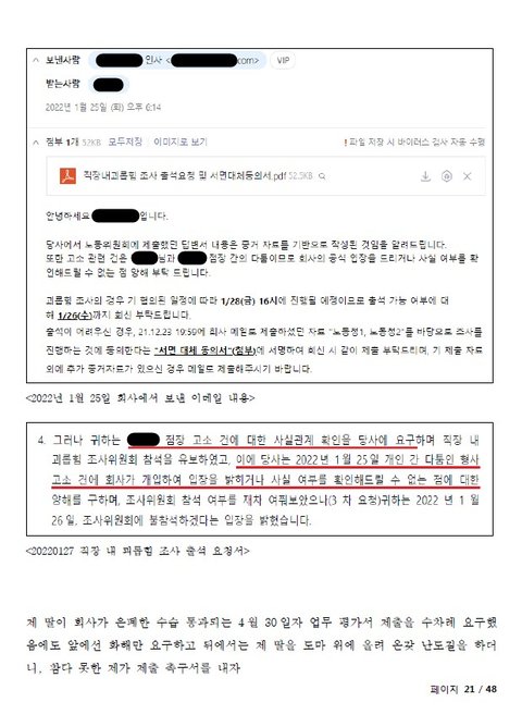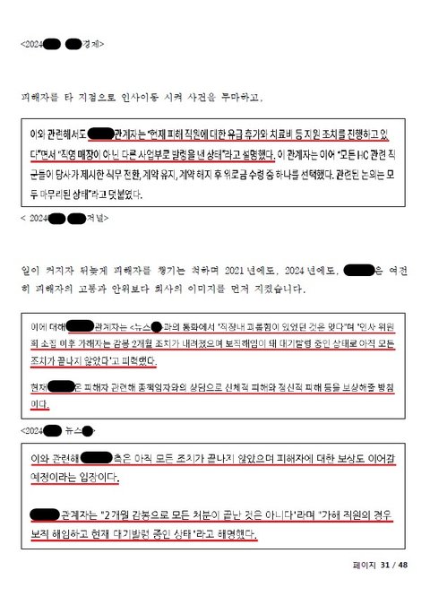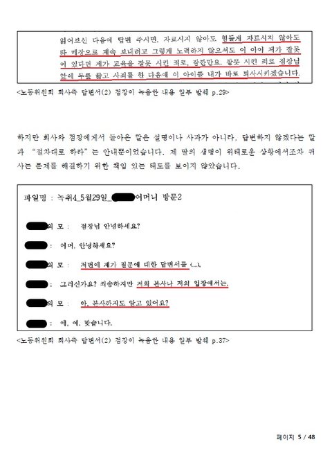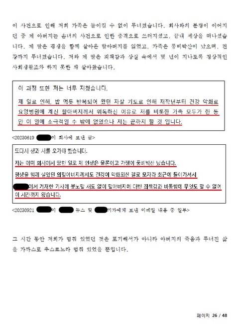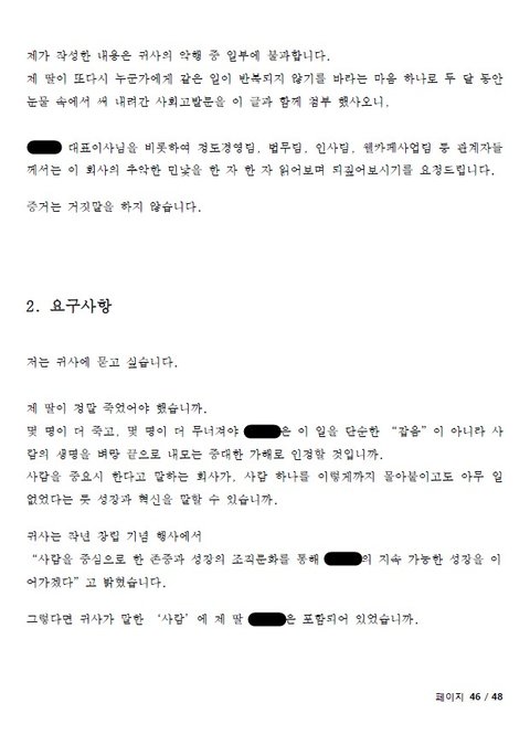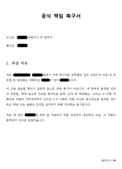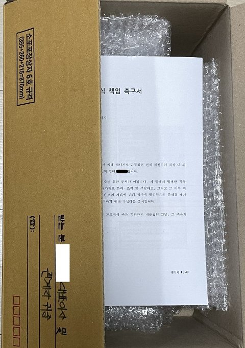회사가 딸의 사고를 막은 저를 법적 조치하겠다고 협박까지 했었기에, 딸이 아닌 제 이름으로 공식 책임 촉구서를 작성했고, 부당해고, 괴롭힘 관련 증거와 함께 약 1500페이지에 달하는 자료를 회사에 전달했습니다.