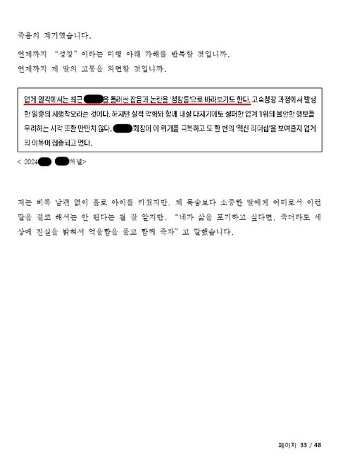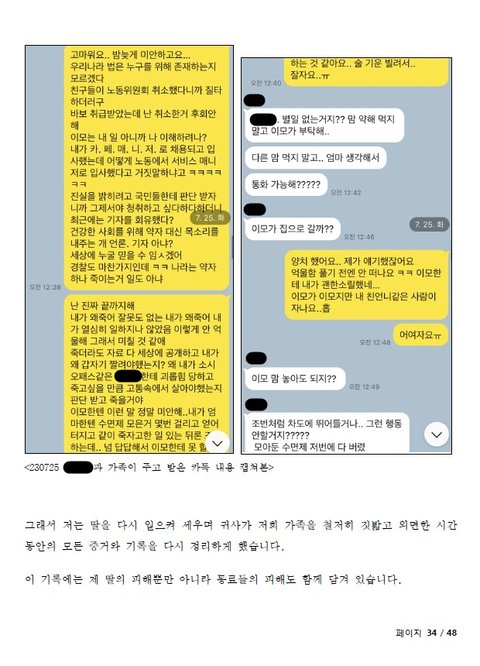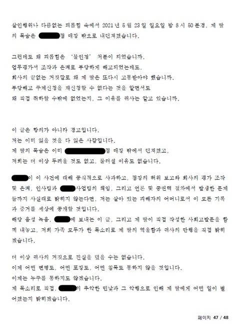 그래서 저는 최근까지도 무너져 있던 제 딸을 다시 일으켜 세우며 자식에게 부모로서 감히 하기 힘든 말이지만.. 죽더라도 억울함을 밝히고 함께 세상을 떠나자고 했습니다.