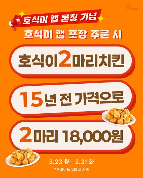 후라이드 2마리 주문하면15년전인 가격 18000원으로 먹을 수 있으니까치킨 드시고 싶으신 분들31일까지 호식이 앱에서 포장 주문하고 드세요!