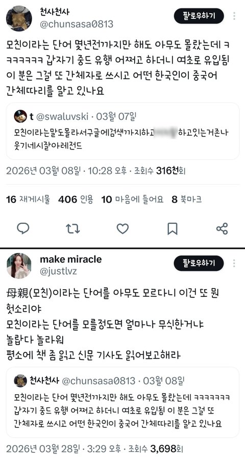 요즘 진짜 자기가 모르는 한자어 쓰면 중국인이라고 하더라 저런사람들 인터넷에만 있는줄 알았는데 남자동기가 현실에서 저런말하길래 인스타차단함;