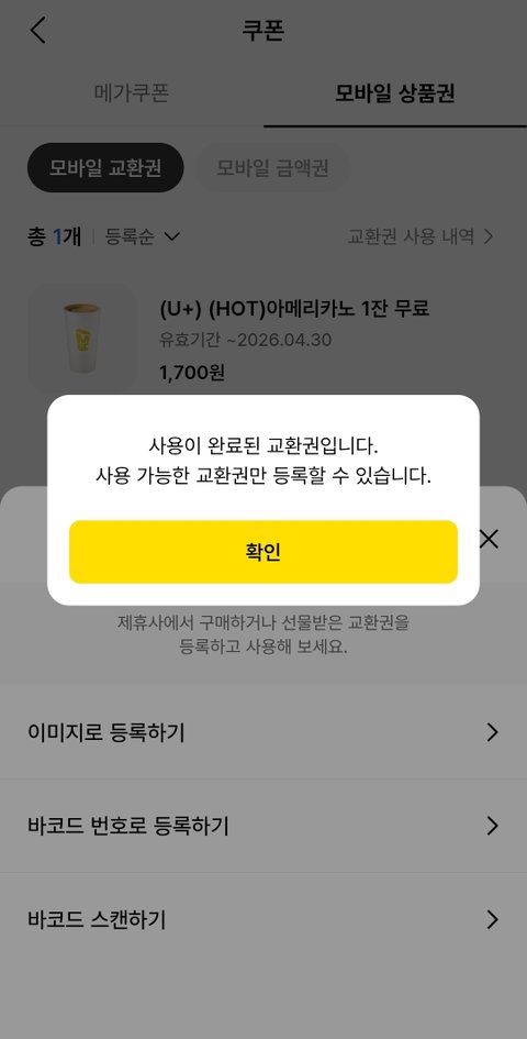 어제 번장에서 깊티 구매했는데 메가 앱에 등록하려니까 이렇게 뜨네... 카카오꺼고 이거 이미 사용 완료된 거 맞지?