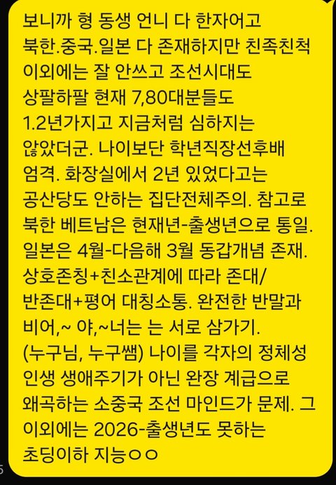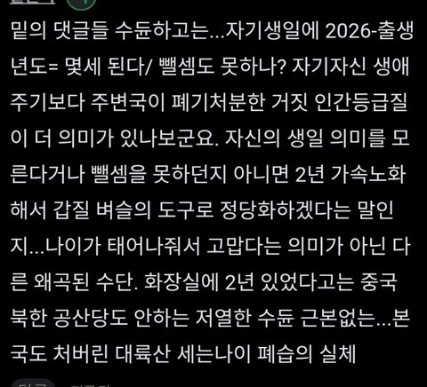 참고로 북한 베트남은 현재년-출생년으로 통일. 화장실에서 2년 있었다고는 공산당도 안하는 집단전체주의 계급신앙.