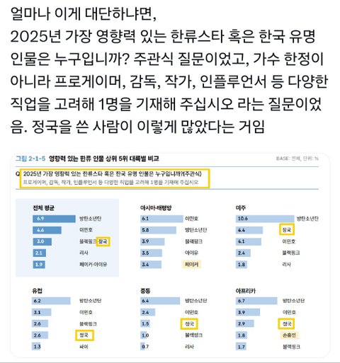 저 방갤 할망구 문체부에서 매년 발표하는 한류실태조사서 보고 신뢰성 0이란다 ㅋㅋㅋㅋㅋㅋㅋㅋ그럼 1위한 방탄은 뭐가 됨? 니새끼도 방탄이야 ㅋㅋㅋㅋ 얼마나 정국이한테 한처먹고 정병짓하면 저런 개소리를 할까 정국이는 개인으로도 이름 올린거 진짜 기특하고 대단해