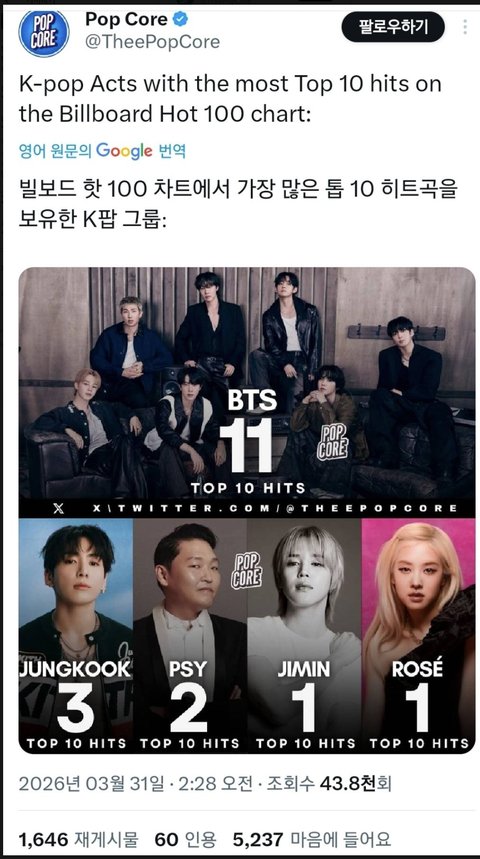 미앺뮤 커하 12위(피프티 60위 아파트 27위 방탄그외 3곡만 미앺뮤 들어간적 있음)