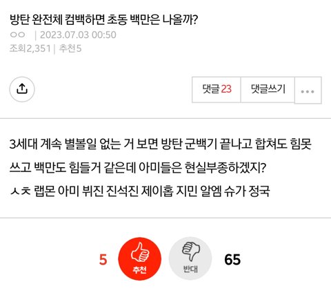 방탄 완전체 컴백하면 초동 백만은 나올까?
