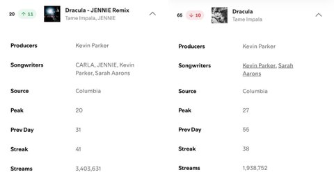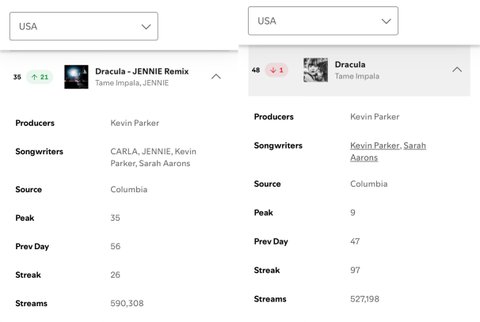 제니 덕에 드라큘라 빌보드 핫백 24위(리믹스 발매 전엔 90위권), 영국 오피셜 차트 12위 (테임임팔라 역대 커리어하이)