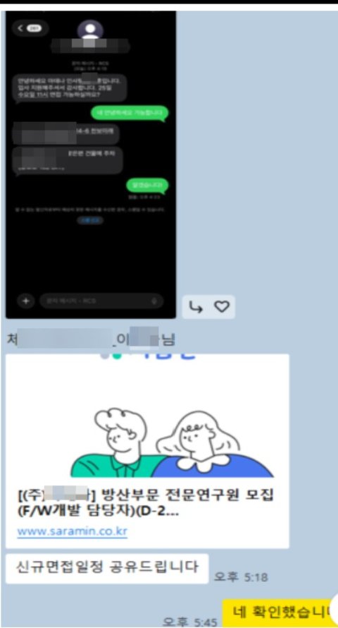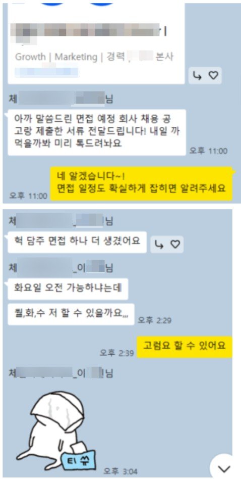이분은 이X빈 수강생님인데 계속 서류탈락했다가 프로그램 참여하고 면접 잡혔다고 연락오심 그러다가 다음날 면접하나 더 생겼다고 다급하게 카톡이 와가지고 월화수 3일 연속으로 면접 스케줄 쳐낼 수 있을지 걱정하심