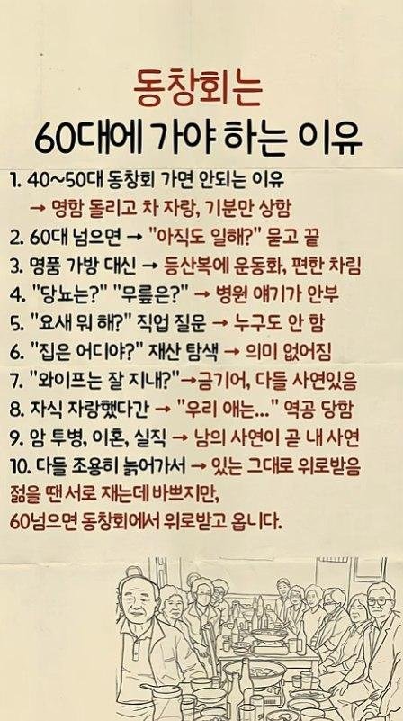 개소리 찰지네. 60이 되면 인생 살아온 결과가 그대로 판이하게 다 드러나고 차이가 더 심해진다. 자식이 있고 없고 자녀의 직업이 어떻고 돈을 얼마를 벌고. 결혼을 해서 며느리가 어떻고 손주가 어떻고 자식들이 뭐를 해주고 용돈을 얼마씩 주고. 젊을 때 어떤 직업으로 어느 만큼 돈을 모아서 사는 동네가 어이고 지금은 돈이 얼마가 있어 어디에 건물이 있고 상가가 있고 자식들한테 집을 줬니 마니 주식이 있는데 돈이 얼마니. 골프를 치니 여행을 어디로 몇 번을 다니니 등 따지고 보면 죄다 돈 얘기로 결론이 나는 게 60대 이상이다. 자랑이나 부심이 아니고 그냥 일상 얘기를 하다보면 격차가 심할 수도 있고 암묵적 서로의 급에 따라 끼리끼리 나뉘게 되고 경제적으로 없을수록 자식들한테 대우를 못받을수록 열등감과 자격지심만 더 커지는 거다. 열심히 살아온 인생이라도 보여지는 결과물이 드러나지 않음에 인생에 회의감 말도 못할 거고. 그러다 우울증 쎄게 온다.