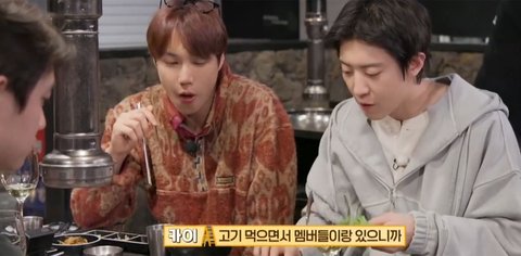 갬성카이: 삼겹살집 와가지구 고기 먹으면서 멤버들이랑 있으니까