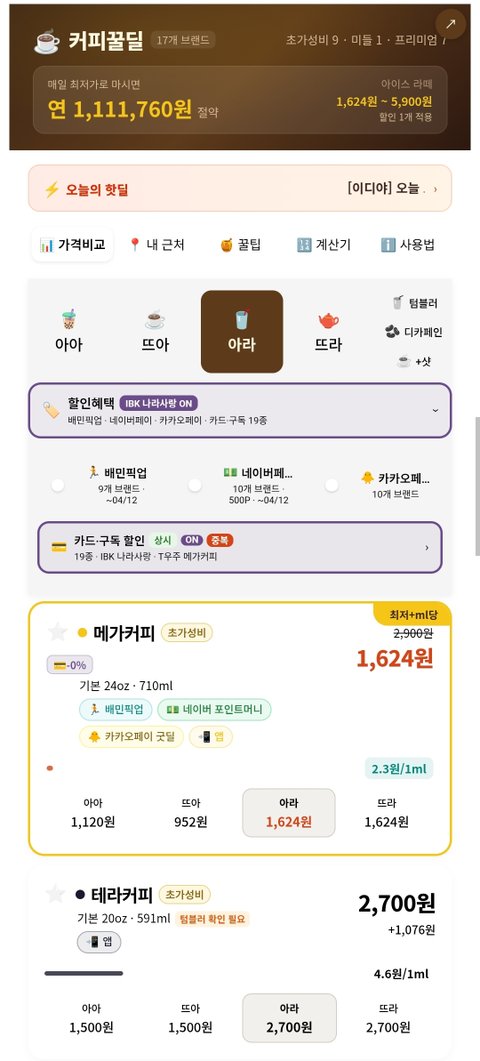 브랜드마다 용량(ml)도 다르고 HOT/ICE 가격 차이도 있어서,할인 적용 체감가가 계산되도록 만들었습니다.