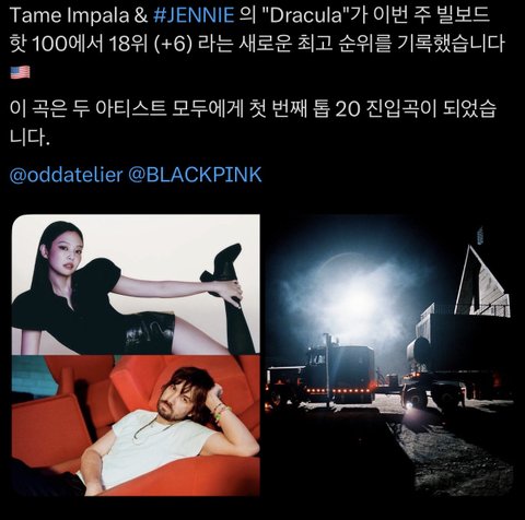 정병들이 제니 후려쳐봤자 리믹스가 원곡보다 미국 성적 월등히 좋아서 크레딧 인정된 거고 테임임팔라 빌보드200 첫 top10 진입이자 빌보드 핫백 커하임 지들이 봐도 제니덕이니까 열폭할만해ㅋㅋㅋㅋㅋㅋㅋ