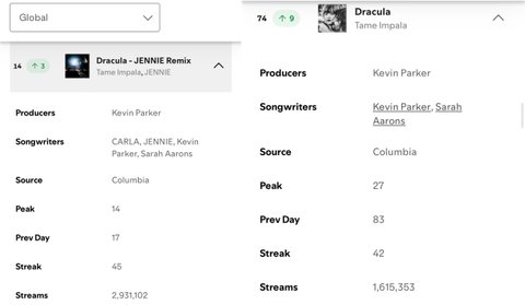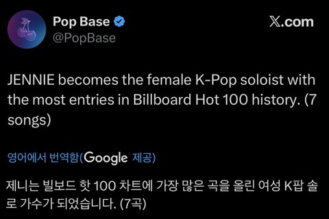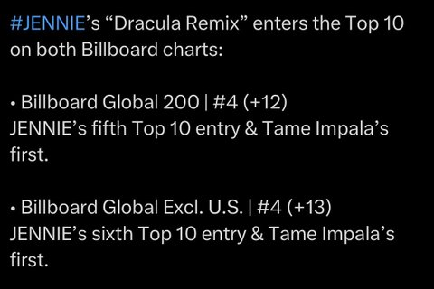 빌보드 글로벌 200차트도 전부 4위해서 테임임팔라 첫 top10 진입 & 제니 5번째 top10 진입